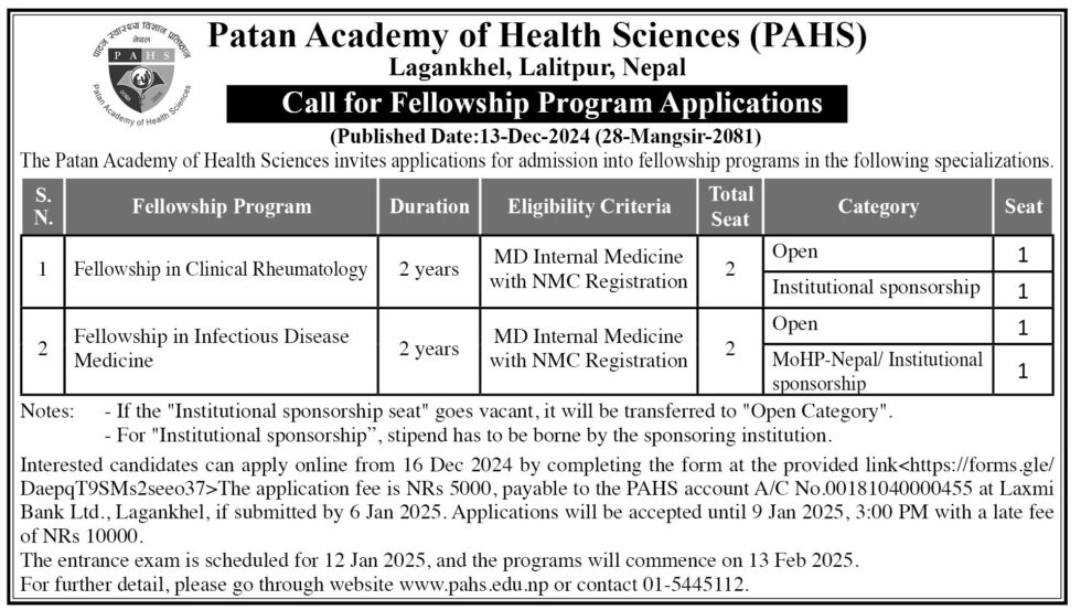 Interested candidates can apply online from 16 Dec 2024 by completing the form at the provided link Fellowship Program Application Form The application fee is NRs 5000, payable to the PAHS account A/C No.00181040000455 at Laxmi Bank Ltd., Lagankhel, if submitted by 6 Jan 2025. Applications will be accepted until 9 Jan 2025, 3:00 PM with a late fee of NRs 10000.